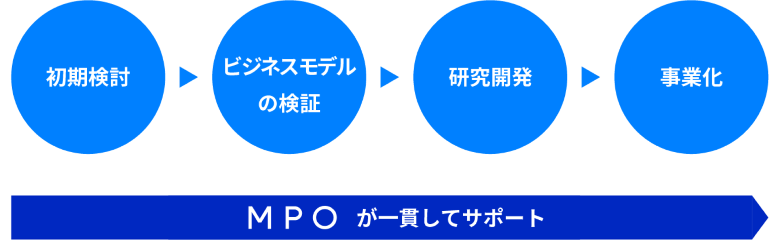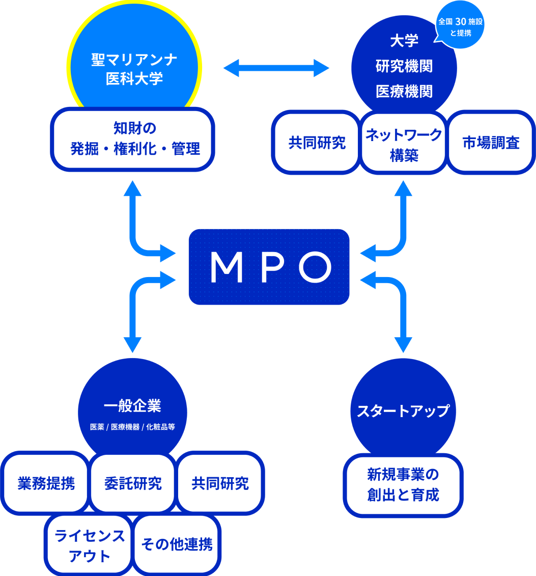MPOはライフサイエンス分野に特化した専門性の高い知識・スキルを有しており、大学・医療機関・企業・スタートアップ・専門家との幅広いネットワークを活用し、知的財産の相談・発掘から事業化までをワンストップでご支援しています。